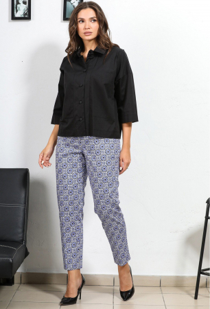 Жакет оверсайз, рукав 3/4; блузка-топ на бретелях; брюки прямые, в поясе по спинке эластичная тесьма.