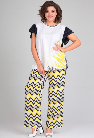 Комплект брючный (из трёх видов ткани). Блуза прямого силуэта. Перед из отделочной ткани с печатью. Спинка и рукав из основной ткани. По боковым швам обработаны разрезы. Горловина округлой формы из трикотажного довяза. Рукав короткий двойной в виде крылышек. Брюки широкие прямые из отделочной ткани с лампасами из основной ткани. Пояс цельнокроенный на резинке.