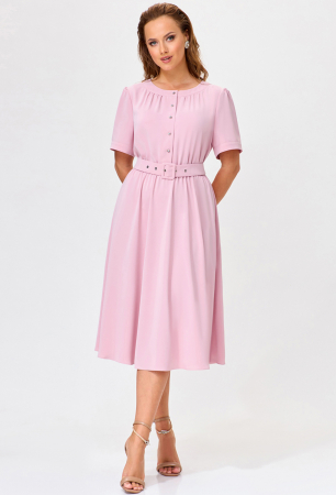 Это платье Х-образного силуэта в равной степени является и элегантным и эффектным. Модель с отрезной линией талии на резинке крайне комфортна в носке и хорошо садится на разные типы фигур. Платье сшили из лёгкой приятной ткани, которая красиво развевается во время ходьбы. Модель с отделочными деталями по горловине дополнили сборкой и застёжкой с ювелирными пуговицами по переду, кокеткой со сборкой по спинке и втачными рукавами с притачными манжетами и сборкой по окату. Линия талии красиво подчёркивается поясом с пряжкой в тон.