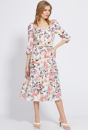 Романтичное и игривое платье олицетворяет стремление к мечте! Оно создано из комфортной вискозной ткани с красивым цветочным принтом и дополнено отделкой в виде тесьмы и красивых пуговиц. Модель Х-образного силуэта длины миди, со скрытой резинкой на талии, с глубоким V-образным вырезом горловины и рукавами-фонариками со сборкой по низу собранной на узкую эластичную тесьму. В боковых швах обработаны функциональные карманы. Завершает образ тонкий пояс-ремень с пряжкой. Уникальная, красивая, современная – эта модель, которая не может отсутствовать в вашем гардеробе.