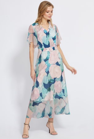 Роскошное платье с модным цветочным дизайном станет Вашим фаворитом для создания специальных летних образов. Идея платья – сочетание разных фактур. Лиф выполнен из приятной немнущейся ткани, а рукава-крылышки и юбка – из струящегося шифона. Модель с V-образным вырезом горловины по переду, отрезная по линии талии. Рукава с фигурной формой низа и разрезами в верхних швах. Для удобства в эксплуатации в левом боковом шве обработана застёжка на потайную молнию, а нижний слой юбки выполнен из приятной вискозной ткани. Линия талии красиво подчёркивается поясом-ремнём с пряжкой в тон.