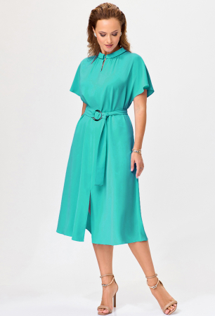 Нежное, лёгкое, комфортное платье А-образного силуэта, выполнено из лёгкой, приятной однотонной ткани. Модель с цельнокроёными рукавами, заканчивающимися разрезами, со щелевидным вырезом со сборкой по горловине переда, отложным воротником с застёжкой на навесную петлю и ювелирную пуговицу и очень женственным разрезом в среднем шве переда. Для создания приталенного силуэта предусмотрен интересный пояс в тон, красиво подчёркивающий талию.