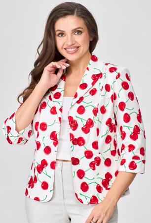 Жакет женский укороченный, полуприлегающего силуэта с центральной бортовой застежкой на пуговицы до линии перегиба лацкана. Спереди рельефные швы от плечевого шва,отрезной бочок и накладной карман. Спинка со средним швом и рельефами от плечевого шва. Рукав втачной, двухшовный, 3/4, с небольшим разрезом в локтевом шве. Воротник пиджачного типа. Жакет на х/б подкладке. Фурнитура может отличаться от студийного фото.
