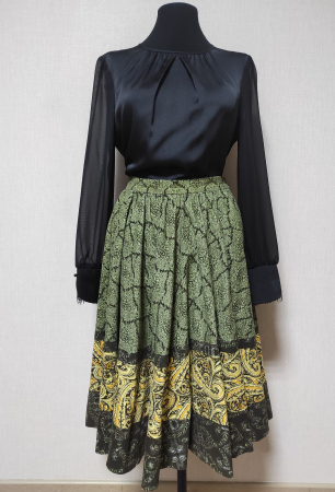 Юбка-клёш (солнце-клёш) из микровельвета. По линии талии выполнена лёгкая сборка, пояс притачной. Застёжка на потайную тесьму-молнии в левом боковом шве. Длина юбки по боковому шву 59см