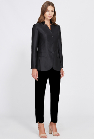 Удобный однобортный жакет полуприлегающего силуэта выполнен из приятной на ощупь ткани. Модель станет удачным вложением в гардероб: днём она будет уместно смотреться в офисе, а вечером в ней можно отправиться на светское мероприятие. Перед с фигурным вырезом горловины, с застёжкой на петли-пуговицы и двумя функциональными карманами с рамками. Рукава втачные двушовные. Воротник-стойка. На подкладке.