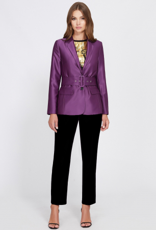 Жакет полуприлегающего силуэта с центрально-бортовой застёжкой на две петли-пуговицы. Перед с горизонтальными параллельными клапанами и рамками. Рукава втачные двухшовные. Воротник отложной с лацканами. На подкладке. Дополняется широким поясом с пряжкой из основной ткани.