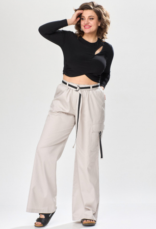 Брюки в стиле “карго” выполнены из однотонной ткани. По передним половинкам выполнены наклонные карманы. По левой передней половинке выполнен накладной карман с клапаном и хлястиком с декоративной тесьмой и застежкой на полукольца. По задним половинкам выполнены накладные карманы. Брюки на притачном поясе с эластичной тесьмой и настроченными шлевками, через которые продет пояс-ремень с застежкой на полукольца.