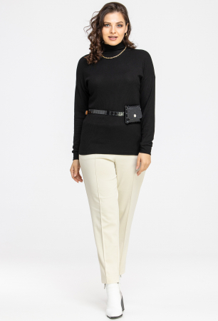 Джемпер выполнен из трикотажа, оригинального по фактуре и очень мягкого и приятного на ощупь. У джемпера полуприлегающий силуэт, чуть спущено плечо,не очень сильно обтягивающий рукав на манжете ,цельнокроенный ворот стойка,не сдавливающий шею ,достаточная длина, чтобы можно было носить с юбками и брюками не заправляя.