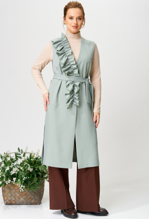 Жилет прямого силуэта из мягкой костюмной ткани. Перед с нагрудной вытачкой. Застежка центральная однобортная на 2 петли и пуговицы. Вдоль правого борта от плечевого шва до линии бедер настрочен декоративный волан. По низу боковых швов разрезы. В боковых швах карманы. Спинка со средним швом.