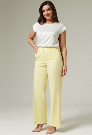Модные женские брюки с высокой посадкой отлично смотрятся на любой фигуре. Длина штанин традиционная. Пояс дополнен шлевками для ремня и петлей-пуговицей. Гульфик делает незаметной застежку-молнию.