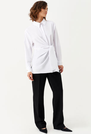 Блузка элегантная прямого силуэта. Воротник на стойке. Низ блузки прямой. По боковым швам раз- резы. Рукав втачной. С завязом на поясе.