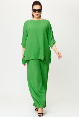 Комплект женский 2-х предметный (блузка, брюки) из тонкой и легкой текстильной ткани- лучший выбор на лето. Отлично подойдет как для повседневной носки (работа, офис, прогулки), так и для праздничных выходов. Достаточно дополнить его соответствующими аксессуарами. Предметы комплекта легко будут сочетаться с вещами из Вашего гардероба. Блузка со спущенным плечом, трапециевидного силуэта с разрезами по бокам. Рукав 3/4 длины с манжетой. Длина рукава фиксируется патой. В качестве декора - нашивка по низу блузки и в верхней части спинки. Брюки прямые, пояс на резинке. По передней части брюк идут подрезы с карманами. Длина по спинке (50-54) - 70 см, (56-60) - 74 см. Длина рукава: (50-60) - 30 см. Длина брюк: (50-54) - 104 см, (56-60) - 107 см.