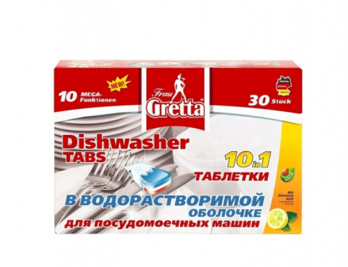 Таблетки для посудомоечной машины Frau Gretta 10 in 1 в водорастворимой оболочке в количестве 30 штук подходят для всех типов посудомоечных машин. Инновационная формула таблеток, разработана с учётом рекомендаций производителей посудомоечных машин и предпочтений потребителей, качественно и бережно очищает посуду, не оставляя разводов; удаляет сложные пятна от чая, кофе, губной помады и т.д.; обеззараживает активным кислородом и придаёт блеск нержавеющей стали; защищает стеклянную посуду от потускнения; препятствует образованию известкового налёта на внутренних частях посудомоечной машины. Свежий аромат лимона нейтрализует неприятные запахи в посудомоечной машине, не оставляя при этом никаких запахов на посуде. Перед загрузкой необходимо очистить посуду от крупных остатков пищи, а если есть сильно подсохшие или подгоревшие места, лучше всего их заранее замочить хотя бы на 5-10 минут. Способ применения: не снимая защитную плёнку, положите таблетку в отсек для моющих средств.