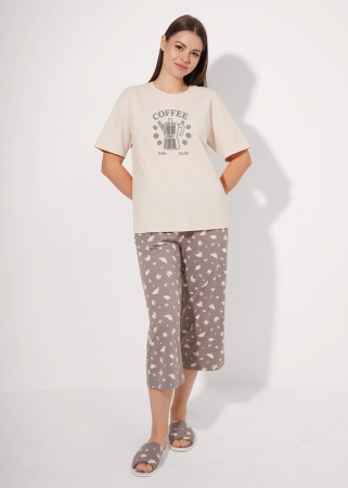Набор одежды для дома и отдыха из хлопкового трикотажного полотна. Футболка прямого кроя. Короткий втачной рукав. Округлая горловина с обтачкой. Спереди принт. Бриджи с поясом на внутренней резинке, спереди нашивка. Боковые карманы с отрезным бочком.