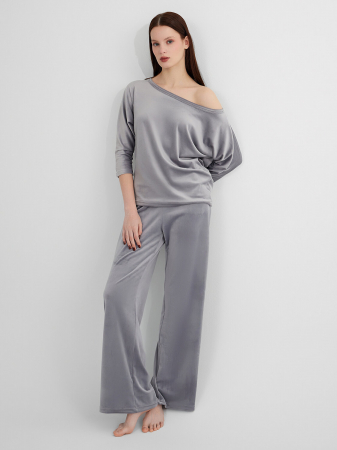 Велюровая женская пижама — это ощущение уюта и нежной роскоши. Комплект состоит из джемпера и брюк, выполненных из мягкого велюра с благородной бархатистой текстурой. Джемпер прямого силуэта с удлиненными рукавами и элегантной горловиной «лодочка» создает расслабленный и изящный вид.