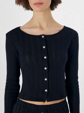 Укороченный домашний жакет — это уютная и женственная вещь для расслабленных дней. Он выполнен из мягкой хлопковой рибаны, которая обеспечивает комфорт, хорошо тянется и приятно облегает фигуру.