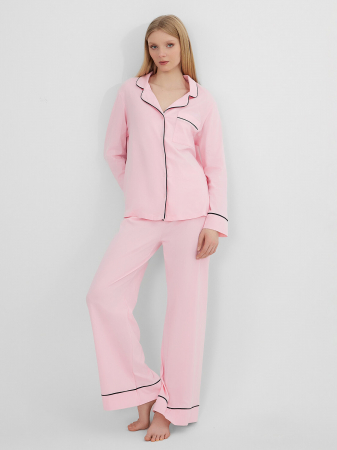 Жакет прямого силуэта. Горловина V-образной формы с отложным воротником и лацканами. По переду обработана центральная застежка на петли и пуговицы. Край борта и воротника оформлен кантом. Рукава втачные длинные, низ рукавов с отрезными манжетами и кантами. На левой половинке переда накладной карман (по заданию). Нижний срез жакета обработан швом вподгибку. Брюки прямые, свободные. Посадка средняя. Пояс цельнокроеный с эластичной тесьмой внутри (внутр. 30мм 30RV). По низу брюк отрезные манжеты с кантами.