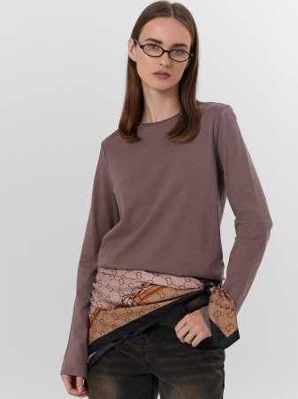 Лонгслив изготовлен из трикотажного полотна кулирка. Лонгсливпрямого силуэта.. Горловина обработана обтачкой с открытым срезом. Шов втачивания обтачки по спинке закрыт бейкой из основного полотна. Рукава втачные длинные. Нижние срезы лонгслива и рукава обработаны швом вподгибку
