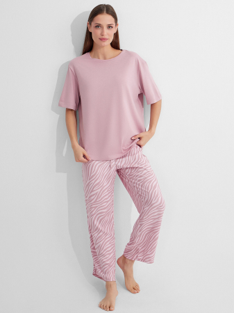 Женский домашний комплект с нежным узором — это воплощение уюта и бережной заботы о комфорте. Пижама состоит из футболки и бриджей прямого кроя, которые дарят полную свободу движений и сохраняют элегантность даже в домашней обстановке.