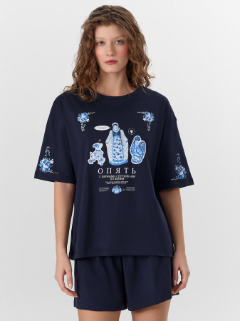 Домашняя пижама с принтом создает атмосферу уютного праздника. Этот набор из футболки и шорт станет верным спутником ваших расслабленных вечеров.