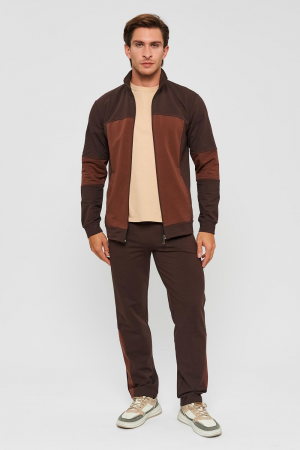 Мужской спортивный костюм из хлопкового трикотажа. В комплекте костюма куртка на манжетах и свободные прямые брюки. Воротник куртки - стойка, полочка и рукава выполнены оригинальным образом комбинацией тканей, застёжка на молнии. Куртка и брюки с удобными карманами. Брюки на поясной резинке, выполнены из однотонного цвета. Модель костюма свободного покроя, не сковывает движений. Такой костюм прекрасно подойдёт как для спорта, так и для отдыха.