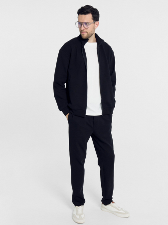 Длинные мужские брюки с классической линией талии, выполненные из интерлока. Силуэт прямой, штанины немного заужены к низу. В поясе – эластичная тесьма и регулировочный шнурок-завязка. Есть удобные боковые карманы. Стильно!