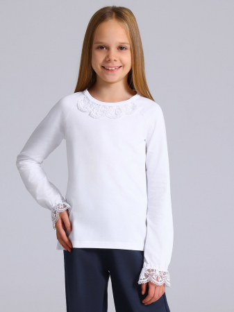 Лонгслив для девочки выполнен из кулира - легкого хлопкового полотна с лайкрой. Изделие полуприлегающего силуэта, длинные рукава-реглан и округлый вырез горловины украшены нежным кружевом.. Отличный вариант для школьницы на каждый день! Уход: только машинная стирка (руками не стирать!) при температуре 40 градусов, без предварительного замачивания.