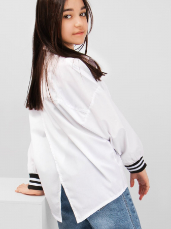 Блузка Соль&Перец модель оверсайз для девочек и подростков на пуговицах. Удлиненная спинка, плечо приспущено, рукава заканчиваются трикотажной манжетой. Блузка прекрасно сочетается как с брюками, так и с юбкой, подчеркнет индивидуальный стиль девочки, и разнообразит ее повседневный школьный образ.