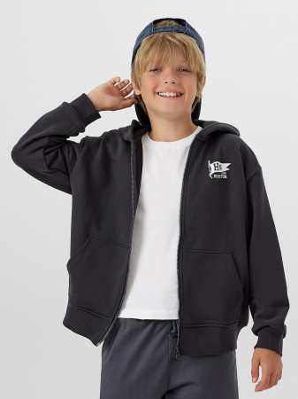 Жакет для мальчиков прямого силуэта с капюшоном. Капюшон на подкладке из основного полотна. Шов втачивания капюшона закрыт х/б тесьмой. Рукава втачные, линия плеча спущена. Притачные манжеты по низу рукавов и притачной пояс из рибаны. По переду застежка молния, карман кенгуру.