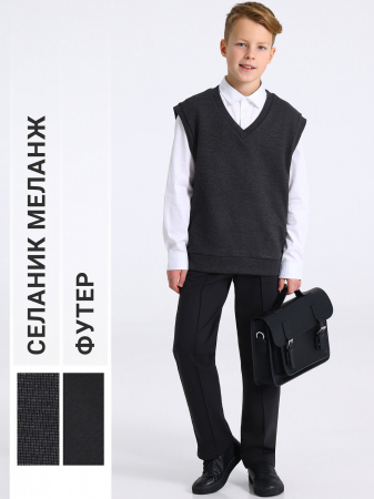 Стильный комплект из жилета и брюк. Жилет для мальчика из теплого вязаного полотна в рубчик, изделие свободного силуэта, со спущенным плечом и v-образным вырезом горловины. Брюки на эластичном поясе выполнены из футера - плотного хлопкового полотна с лайкрой, имеет удобные карманы и декоративные отстрочки-стрелки. Уход: только бережная машинная стирка до 40C (руками не стирать), изделие вывернуть наизнанку, без предварительного замачивания. Барабанная сушка запрещена. Ассортимент осенне-зимнего периода.