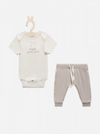 Комплект состоит из боди и ползунков для 1-3 месяцев (рост 56-62),выполнено из интерлока. Швы на лицевой стороне изделия Боди выполнено из интерлока. Спинка и перед цельнокроенны. Спинка с переходящей кокеткой и цельнокроенной ластовицей. Горловина круглая, окантована бейкой из основног полотна. Припуски верхних и нижних срезов переда и спинки окантованы бейкой из основго полотна. Рукава короткие, втачные, одношовные.