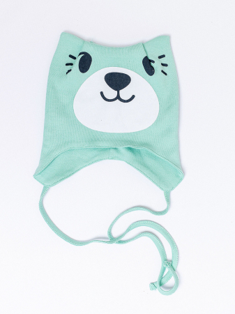 Шапочка для новорожденных на завязках в мятной расцветке с принтом в виде мордочки. Нежный пастельный базовый оттенок подойдет как девочкам, так и мальчикам. Шапочка для новорожденного малыша выполнена из мягчайшего 100 % хлопка (интерлок).