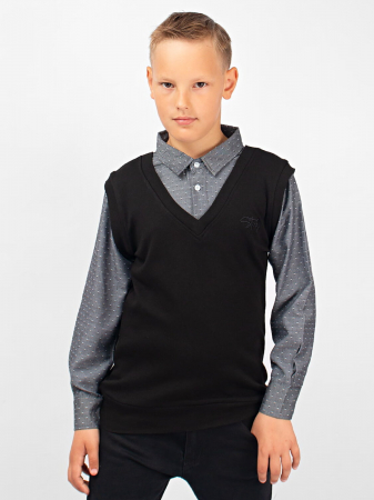Джемпер-обманка с имитацией рубашки. Жилет с V-образным вырезом, выполнен из мягкого, приятного к телу трикотажа. По низу изделия - манжет. Имитация рубашки так же выполнена из натурального материала, на груди застегивается на две пуговицы. Идеальный выбор для создания классического школьного образа.