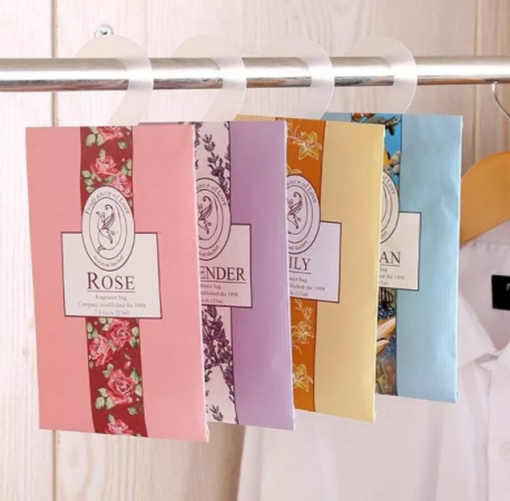Арома-саше имеют удобную вешалку и могут закрепляться на перекладине между весящей одеждой. Вещи и пространство шкафа равномерно пропитываются приятным ароматом.