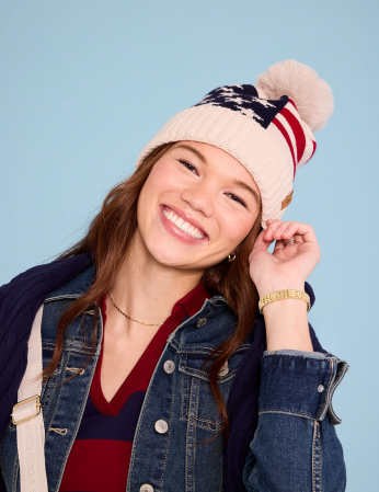It brings together nostalgic Americana style and modern winter fashion, topped with a cozy pom pom—making it your go-to beanie for festive, cold days.