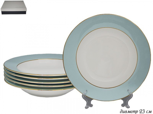 Набор из 6 глубоких тарелолк 23 см, серия BLUE: высококачественный фарфор, золотая обводка, элегантный небесно голубой декор, изящные формы