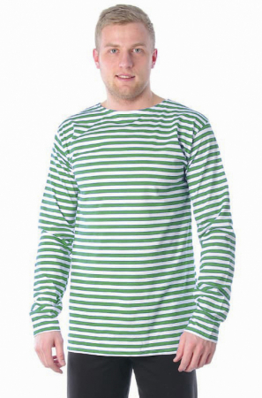 Тельняшка изготавливается из хлопчатобумажной трикотажной ткани с чередующимися горизонтальными полосками. Полосатые тельняшки стали традицией и весьма популярны в качестве романтического символа моря, морской службы, храбрости и удали. В производстве используется трикотаж, кулирное полотно, плотностью 150 г/м2 состав 100% хлопок.