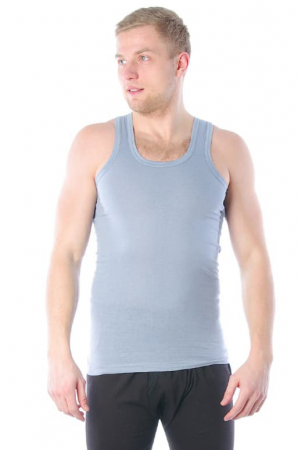 Майка мужская однотонная классический покрой, горловина и пройма обработаны трикотажной окантовкой. Изделие произведено в Узбекистане из трикотажного гладкокрашенного кулирного полотна плотностью 150 г/м2, состав 100% хлопок.