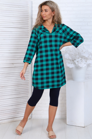 Удобный, стильный и невероятно женственный костюм для повседневного образа. Удлинённая туника-рубашка с отрезной кокеткой и отложным воротником. Модель с удлинённой спинкой, комфортный рукав 3/4. Бриджи облегающие, длина ниже колена, пояс на резинке.