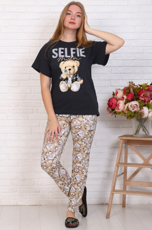 Симпатичный и удобный домашний костюм из качественного кулирного полотна. Футболка с коротким рукавом, на полочке печатный принт. Брюки с боковыми карманами, зауженные книзу, пояс на резинке. Ткань кулирка.