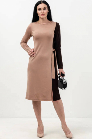 Элегантное женственное платье приталенного силуэта из мягкого, эластичного трикотажа - "милано". Интересное комбинирование тканей мягких цветов, сбоку декоративный пояс и небольшой разрез - образ получается нежным и очень стильным.