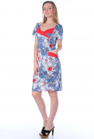 Прямое облегающее платье "джинсовой" расцветки с яркой красной отделкой выреза на груди и карманов.