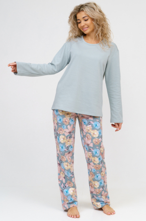 Тем, кто ценит домашний комфорт и уют, несомненно понравится эта пижама! Симпатичная хлопковая модель смотрится очень мило. Однотонная кофта с длинными рукавами, кокетка на полочке в области плеча. Брючки прямые, с боковыми карманами, пояс на широкой резинке.