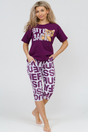 Пижамка с футболкой и бриджами. Футболка прилегающего силуэта со сспущенным плечом и коротким рукавом, на полочке печатный принт. Бриджи прямые длиной ниже колена с внутренними карманами.