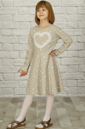 Классическое хлопковое платьице с длинным рукавом нежной спокойной расцветки. Платье отрезное по линии талии, юбка расклешёная. Полочку украшает оригинальная аппликация.