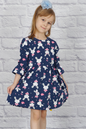 Очаровательное летнее платье для девочки. Пышная отрезная юбка на талии собрана в складочки, рукава 3/4 с воланом. Очень мило смотрится забавный рисунок на ткани "симпатичные зайчата".