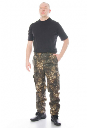 Удобные брюки для охотников и рыбаловов из ткани грета. Модель прямая, с застроченными "стрелками", пояс спереди и гульфик на пуговицах, сзади широкая резинка, удобные боковые карманы и накладные по ноге, с клапаном на пуговицах.