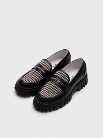 Модные туфли-лоферы на массивной подошве для девочки подростка. Школьные лоферы выполнены из искусственной кожи и текстиля с рисунком "гусиная лапка". Подкладка - 100% натуральная кожа. Кожаная стелька с анатомическим элементом обеспечивает правильную нагрузку на стопу школьницы. Формоустойчивый задник поддерживает стопу в правильном положении. Подошва не скользит и устойчива к истиранию. Туфли отлично подойдут как сменка в школу и для прогулок: весна, осень.