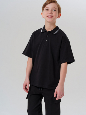 Школьная черная футболка поло оверсайз с коротким рукавом для мальчика подростка от PlayToday — стильный и практичный выбор для школы и повседневных образов. Современный свободный крой и качественный хлопок пике делают эту модель удобной и универсальной.