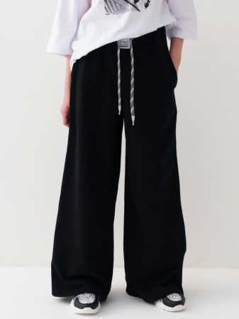 Спортивные широкие брюки для девочки подростка. Выполнены из мягкого хлопкового трикотажа футер без начеса. Пояс на резинке для удобства и регулировки предусмотрен шнур. По бокам расположены карманы. Спереди, на поясе - декоративная нашивка.